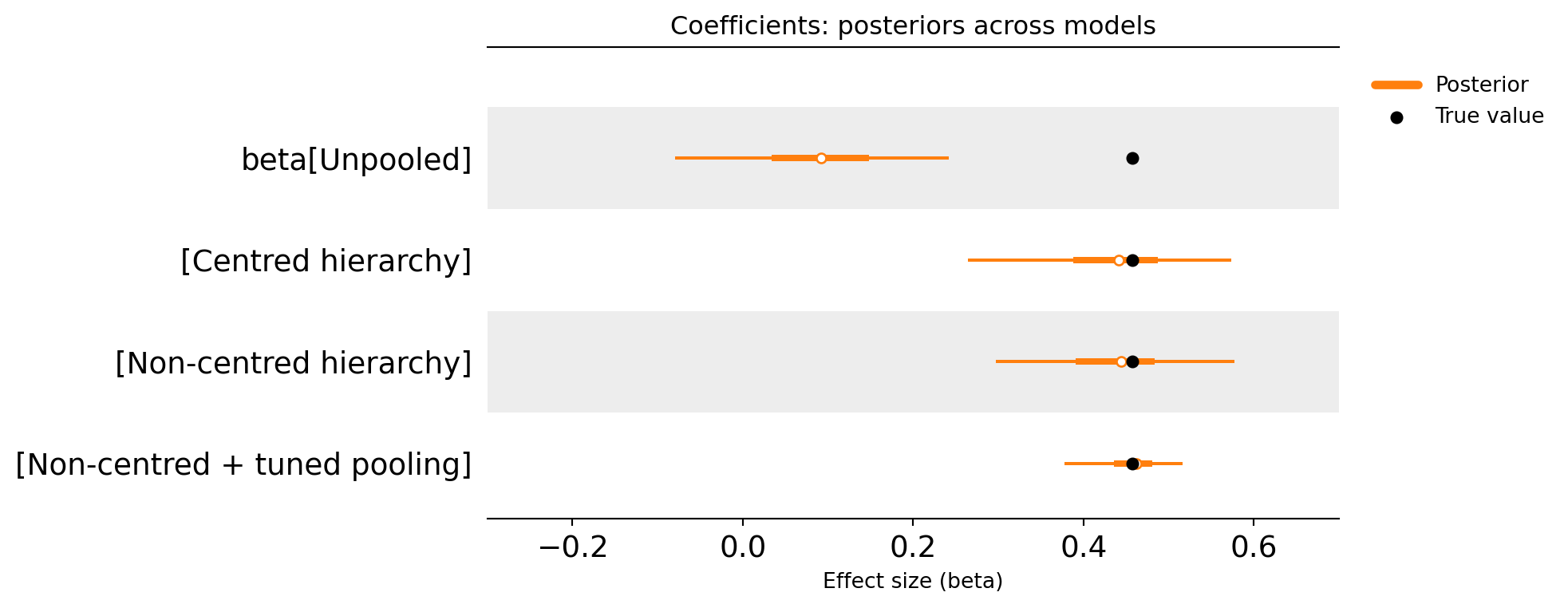At this stage, the hierarchy is improving the stability of the estimates more than it is reducing uncertainty. The next step is to reparameterise the same hierarchical model in a way that tends to behave better when the signal is weak.
