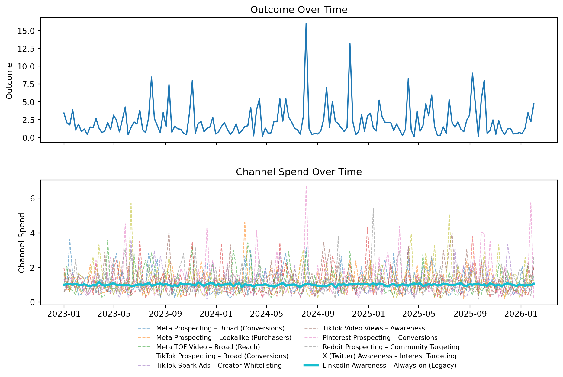 A key part of the setup is that LinkedIn Awareness (Always-on) is deliberately designed to be difficult to measure. It has low spend relative to the rest of the portfolio and, more importantly, it shows very little week-to-week variation. This is a common real-world pattern for always-on awareness campaigns, and it’s exactly the kind of situation where MMMs tend to produce unstable or overly uncertain estimates.