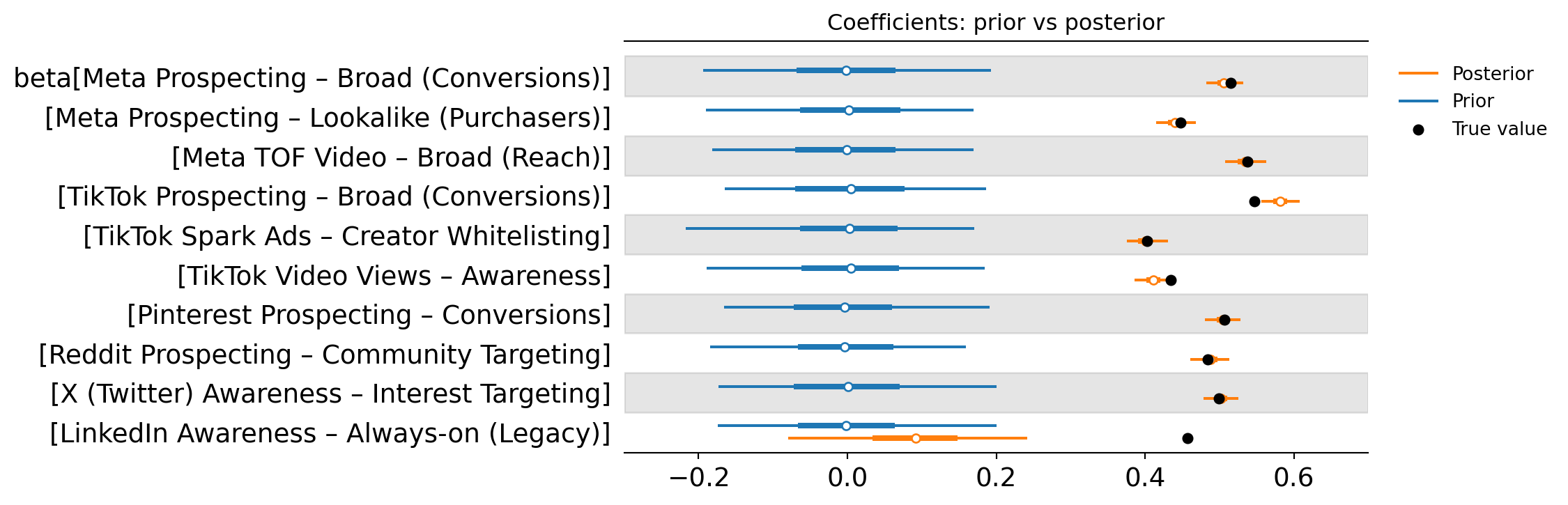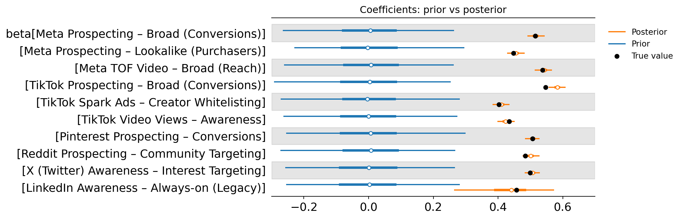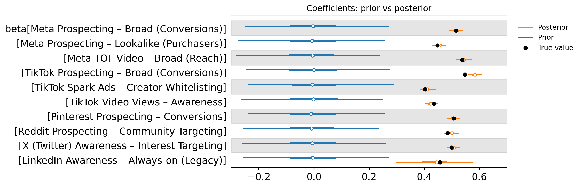 The forest plot below shows the prior vs posterior distribution of each campaign’s effect size, summarised with a point estimate and a 94% credible interval. In practical terms, this is the MMM’s estimate of how strongly each campaign contributes to the outcome, along with the uncertainty around that estimate.